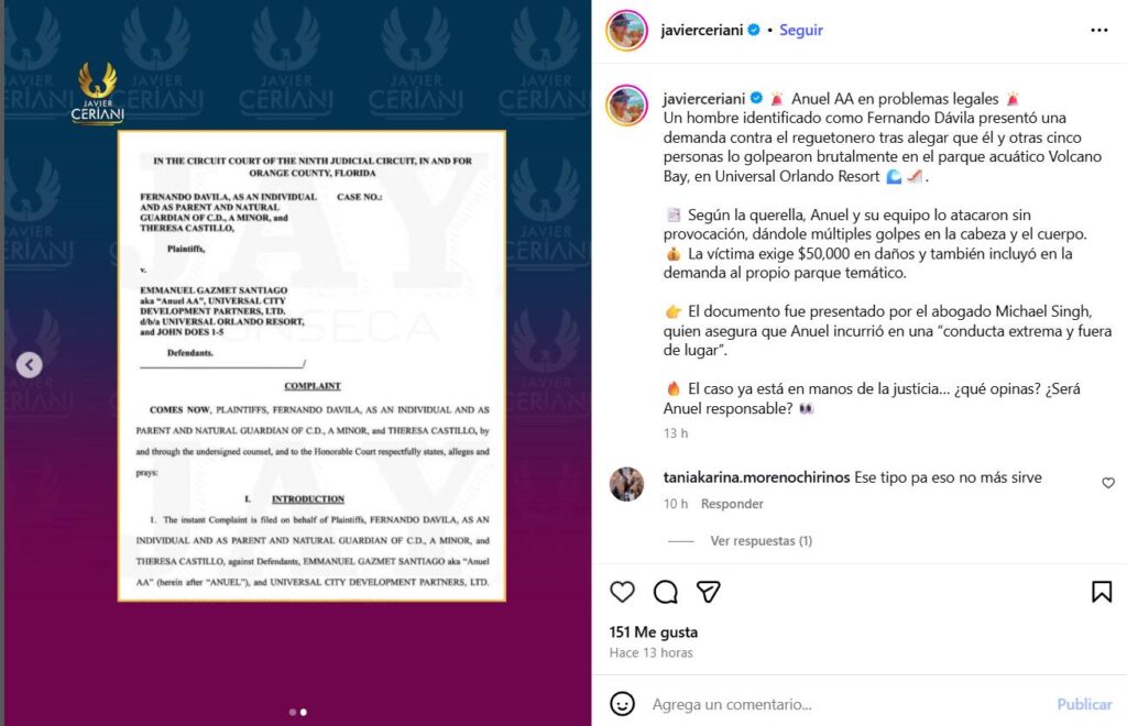 La licenciada Melanie Rivera informó que el cantante Anuel fue demandado por Fernando Dávila por alegada agresión el pasado 25 de abril de 2025 en el parque acuático Volcano Bay en Florida.
