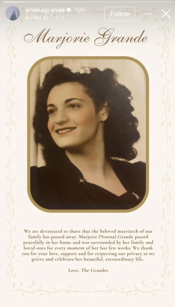 La artista Ariana Grande emocionó profundamente a sus seguidores en redes sociales al publicar un emotivo mensaje en el que anunció la muerte de su abuela, Marjorie Grande, quien falleció a los 99 años.
