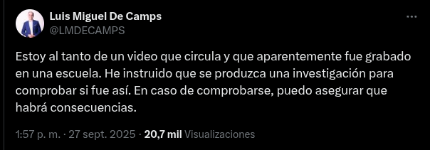 En relación con el tema, el ministro de Educación, Luis Miguel DeCamps, expresó que tiene conocimiento del video que circula en redes y que, según parece, fue filmado dentro de un plantel escolar.
