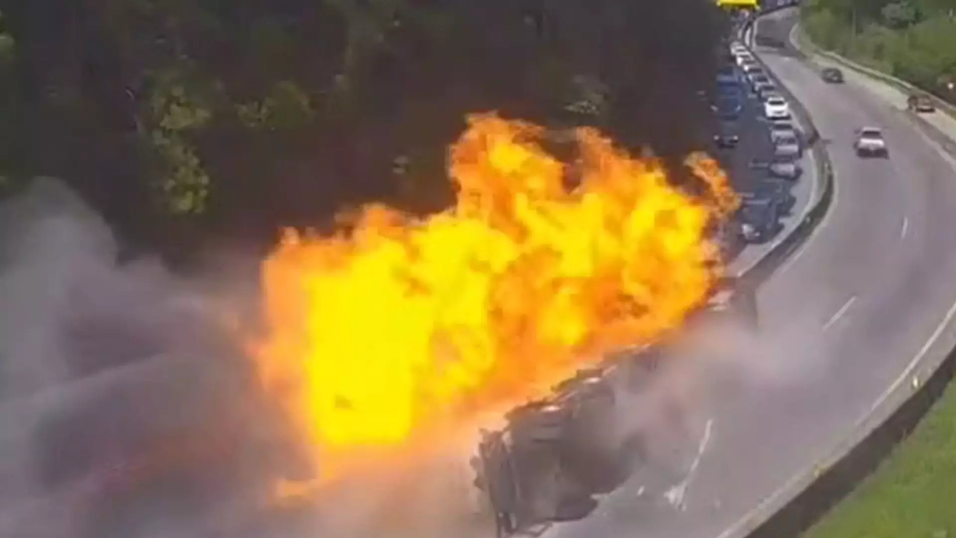 Cámaras de circuito cerrado captaron el momento exacto en que se produjo el accidente y se puede ver la fila de vehículos retrocediendo para evitar el fuego.