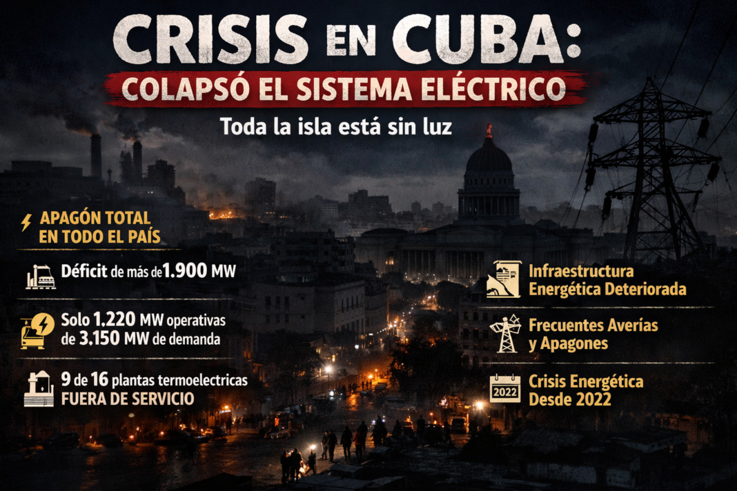 Cuba atraviesa nuevamente una grave crisis energética luego de que se registrara una desconexión que afectó el Sistema Electroenergético Nacional, dejando a gran parte del país sin servicio eléctrico. La situación fue confirmada por la Unión Eléctrica (UNE), entidad encargada de la generación y distribución de electricidad en la isla.