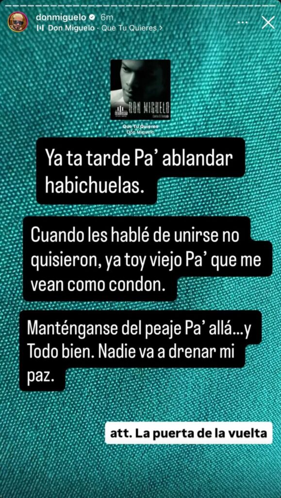 No obstante, Don Miguelo respondió mediante una publicación en su cuenta oficial, dejando en claro que no tiene interés en participar en el proyecto. “Ya es tarde para ablandar habichuelas. Cuando propuse unirnos, no quisieron. Ahora estoy viejo para que me usen como condón. Quédense del peaje pa’ allá… y todo bien. Nadie va a alterar mi paz. Atentamente, La puerta de la vuelta”, escribió el artista.