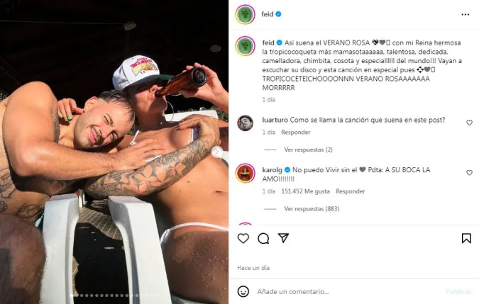 “Así se vive el VERANO ROSA con mi Reina hermosa, la tropicocoqueta más increíble: talentosa, trabajadora, dedicada, una chimba total y única en el mundo. Vayan ya a escuchar su álbum y esta canción en especial”, escribió Feid en su cuenta.
