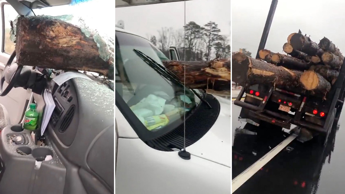 Un hombre conducía una furgoneta por una carretera de EE.UU. detrás de un camión cargado de troncos cuando, de repente, uno de estos salió volando hacia su vehículo y se empotró contra el centro del parabrisas. Se informa de que el conductor salió ileso.