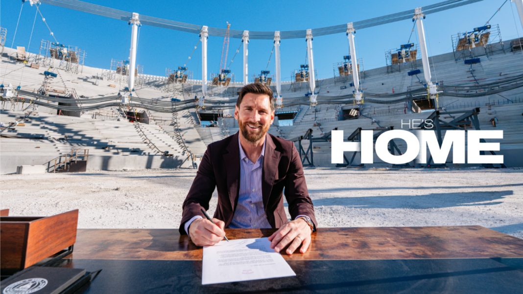 Tras la rúbrica, sonríe, y la cámara se abre mostrando que se encontraba en el centro del campo del Miami Freedom Park, todavía en construcción pero con la estructura ya reconocible. Este será el nuevo estadio del equipo en 2026, tal como se menciona en el comunicado oficial.